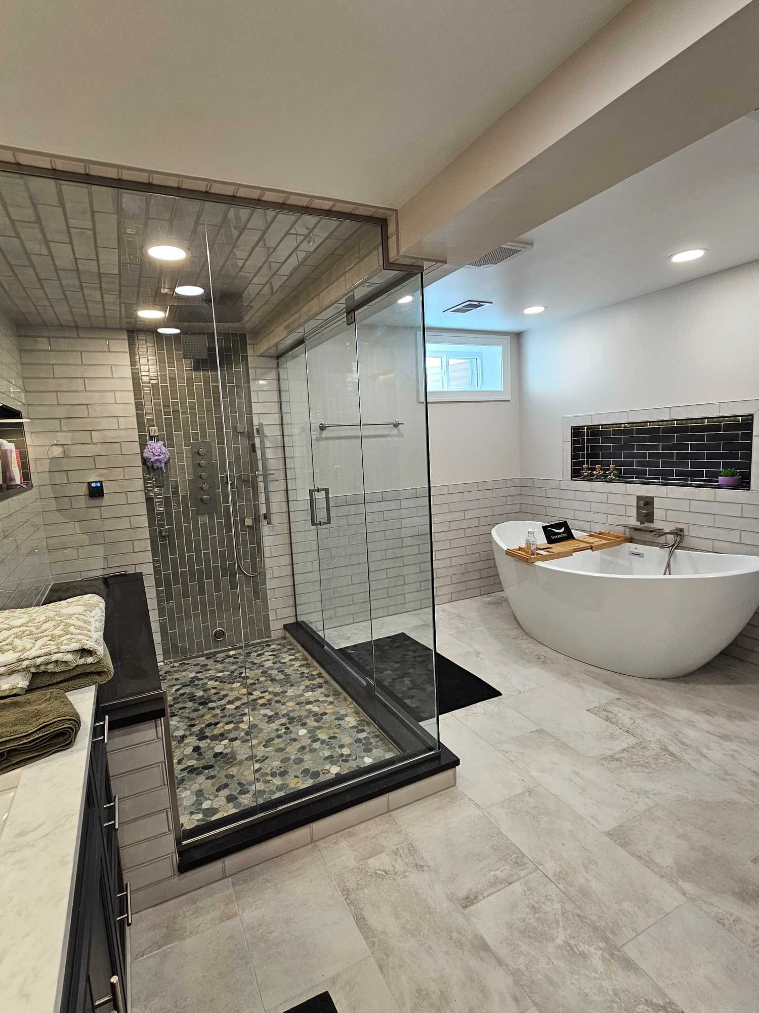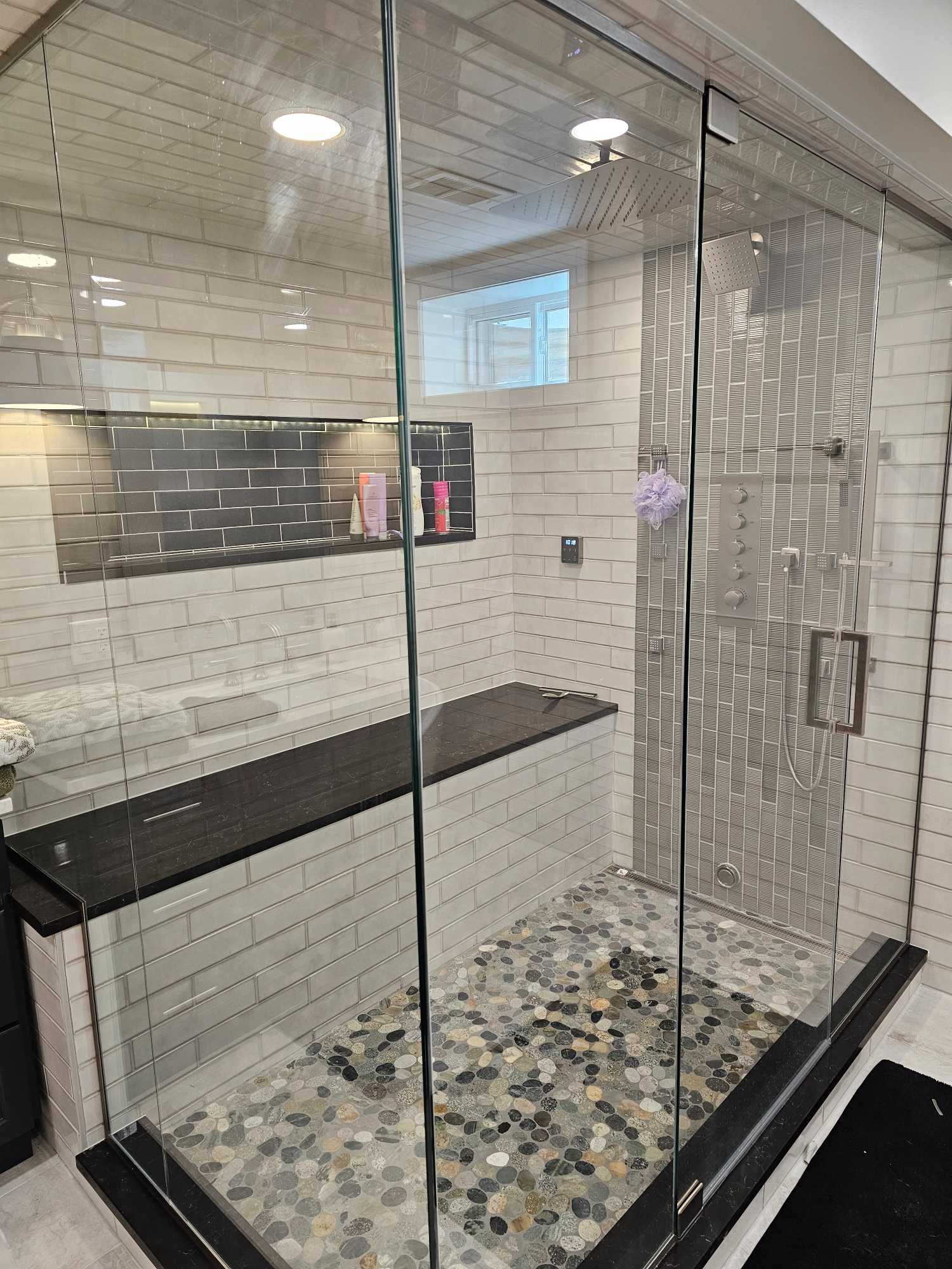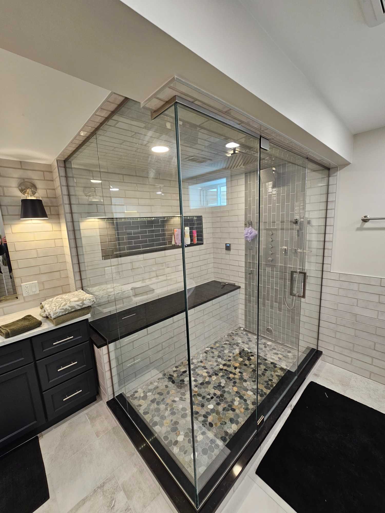 Elegant bathroom renovation with upgraded layout, custom shower, and high-quality finishes.