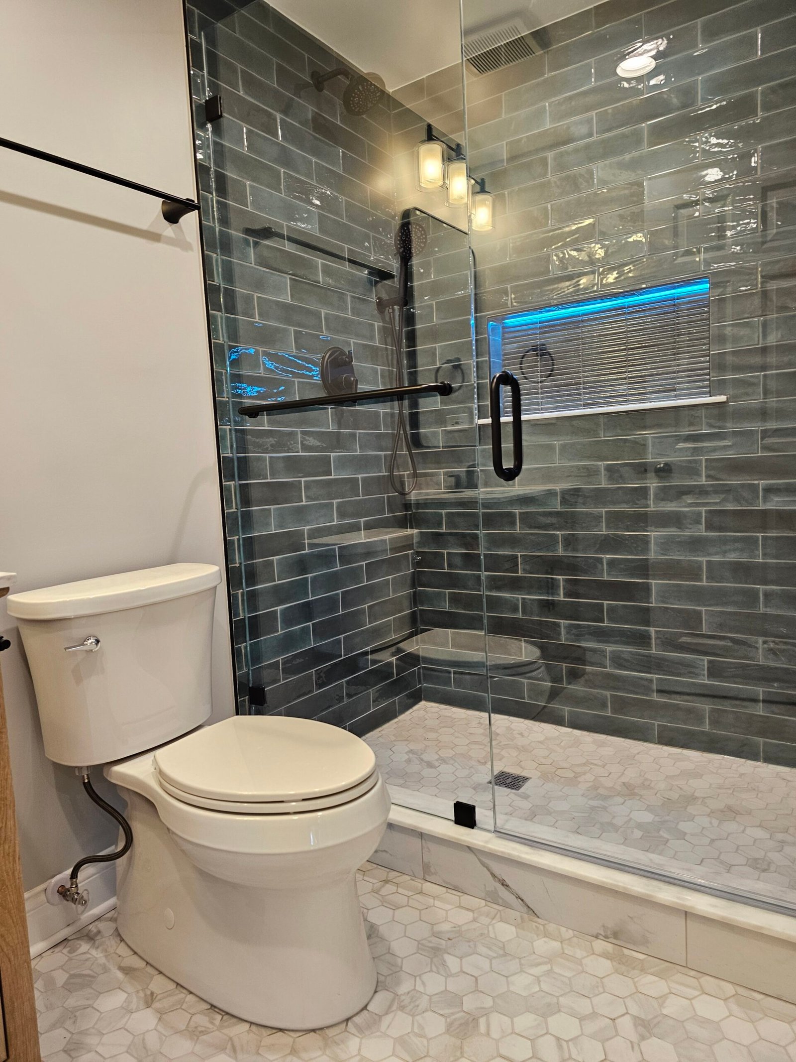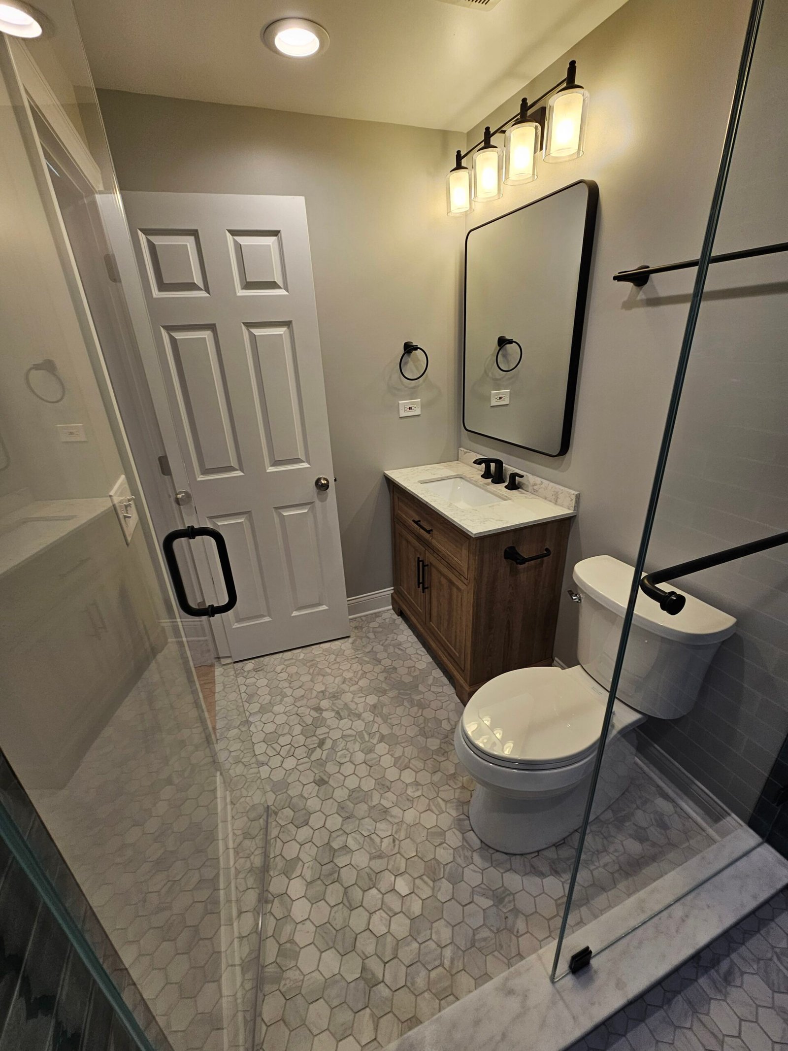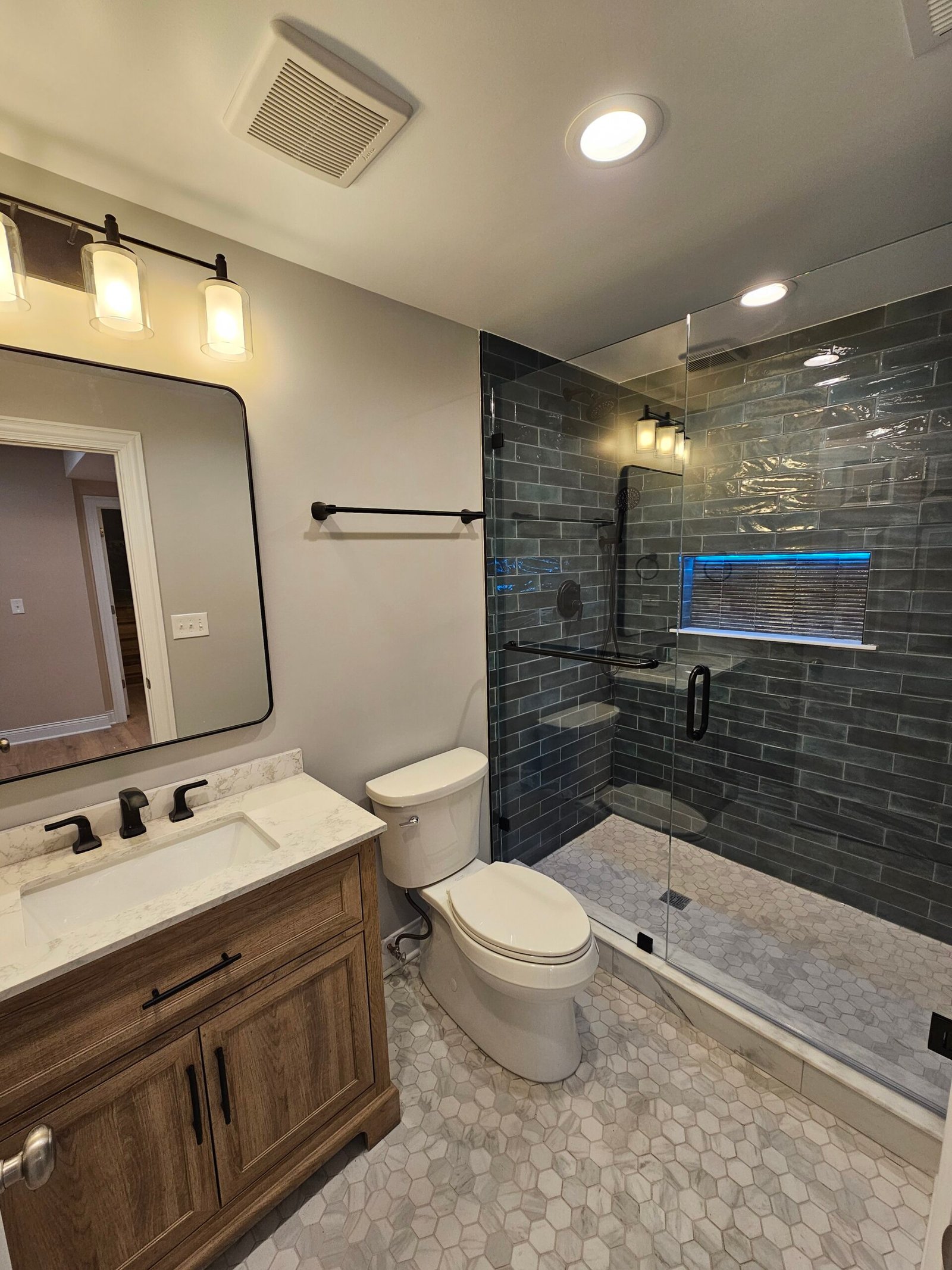 Modern bathroom renovation with improved layout, custom shower, and high-quality finishes.