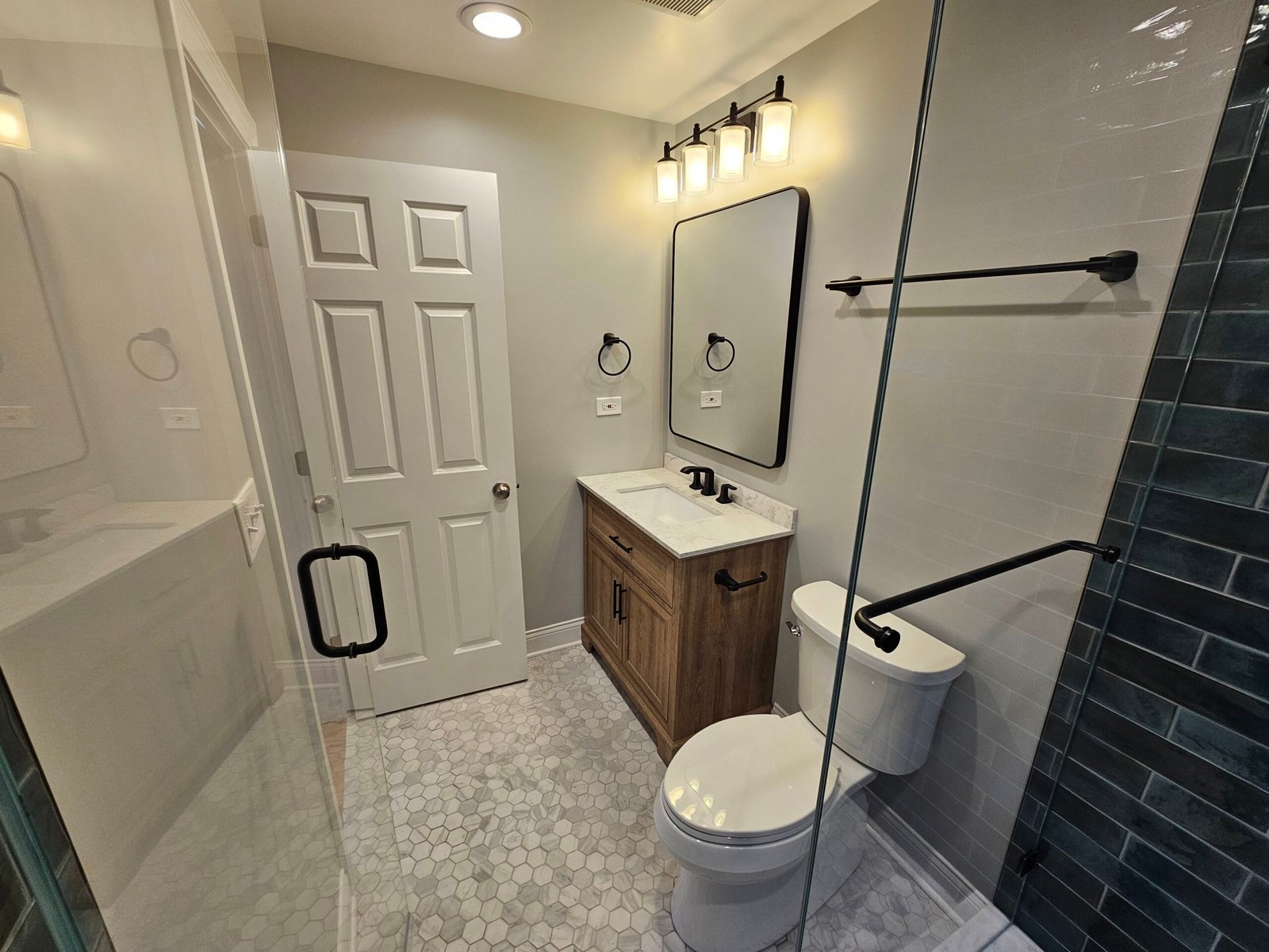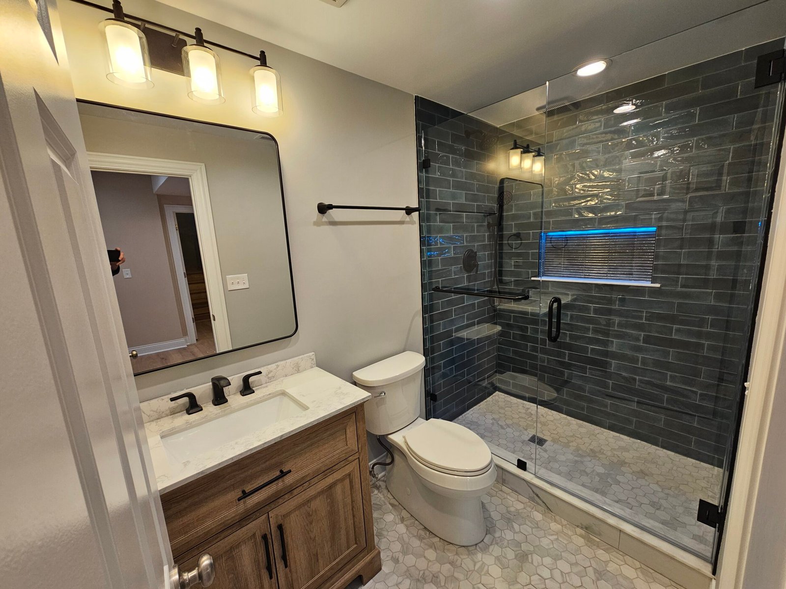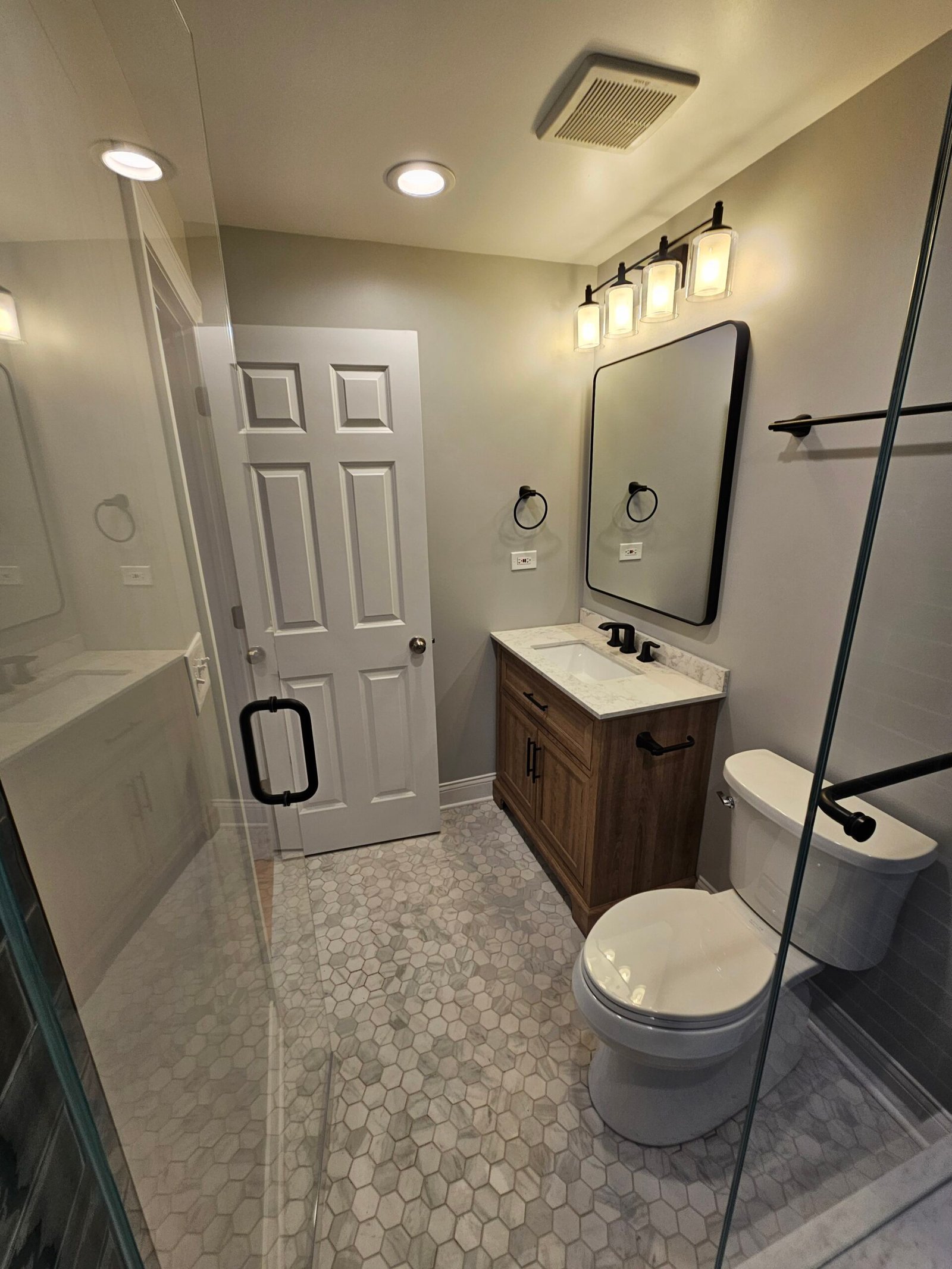 Modern bathroom renovation with improved layout, custom shower, and high-quality finishes.